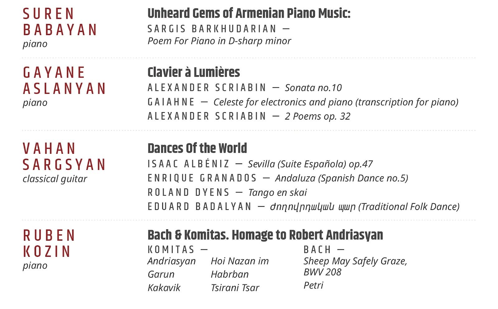 “This performance is dedicated to the hidden gems of Armenian piano music, which, unfortunately, have not found a place in the repertoires of Armenian or foreign pianists, despite having all the prerequisites to gain wide recognition and leave a strong impression on listeners.
